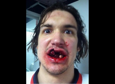Mitch Callahan, un joueur de hockey des Grand Rapids Griffin, aux Etats-Unis, a reçu un palet sur la bouche en plein match.